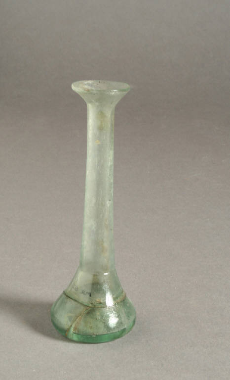 Balsamario con labbro estroflesso, lunghissimo collo cilindrico separato con una strozzatura dal piccolo corpo tronco conico, fondo piatto