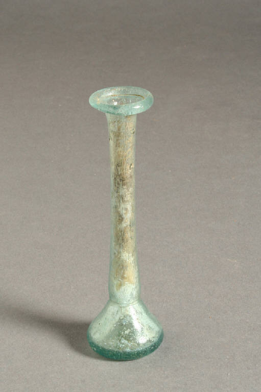 Balsamario con labbro estroflesso, lunghissimo collo cilindrico separato con una strozzatura dal piccolo corpo tronco conico, fondo piatto