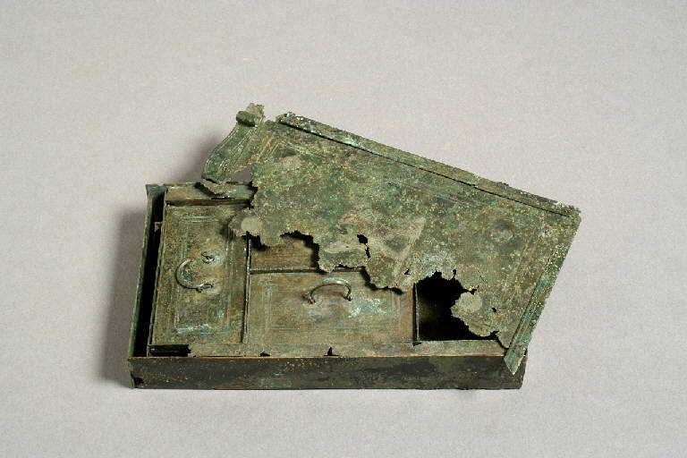 Contenitore di forma quadrata, composto di più scomparti dotati di coperchi autonomi con manico a volute, poggiava su piedi a volute. Decorazione: a incisioni