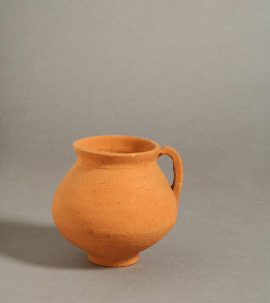 Orlo diritto a profilo arrotondato, corpo globulare a ventre ribassato, alto piede ad anello, ansa a listello impostata nel punto di massima espansione del ventre e saldata sotto l'orlo