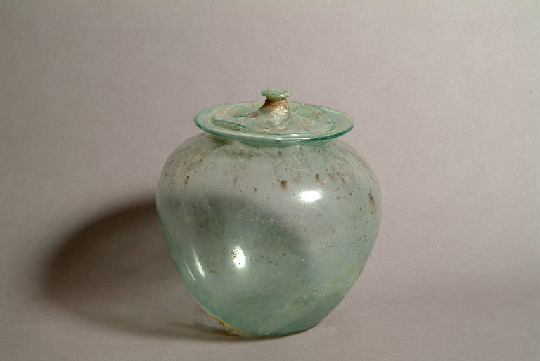 Olla con corpo globoidale, fondo concavo, labbro estroflesso ribattuto così da formare un largo bordo orizzontale. Il coperchio è piatto con presa in forma di collo di bottiglia