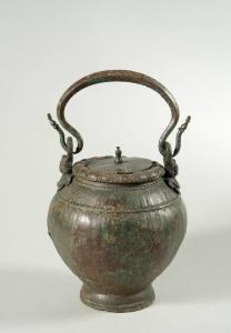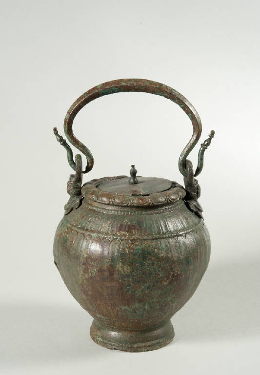 Situla su basso piede decorato da un motivo a perline; il corpo globulare, invece, presenta motivo a bacellature incese, interrotte sotto l'attacco dei manici da un'altra fila di perline. Il bordo dell'apertura è decorato da ovuli allungati e leggermente schiacciati. Il manico, a sezione quadrata, si inserisce entro i ganci fissati sul corpo del contenitore. E' dotata di coperchio.