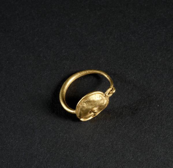 Verga a sezione circolare desinente con gancio che trattiene l'anello posto all'altra estremità; castone in lamina bombata applicato sulla verga in prossimità dell'anello