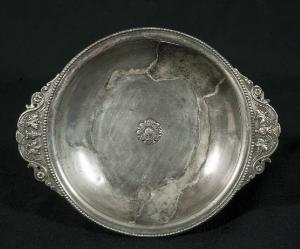 Piatto in argento con basso anello di appoggio, bassa parete arrotondata, bordo orizzontale perlinato con prese orizzontali decorate a cesellatura con foglie di vite uscenti da crateri. Al centro della vasca rosetta a incisione