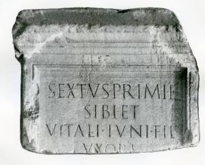 Parte superiore di ara funeraria modanata di Sextus. Il testo epigrafico è inciso su una superficie incorniciata da gola rovescia e fascia liscia. La cornice superiore presenta, dall'alto, gola concava, listello e gola rovescia.