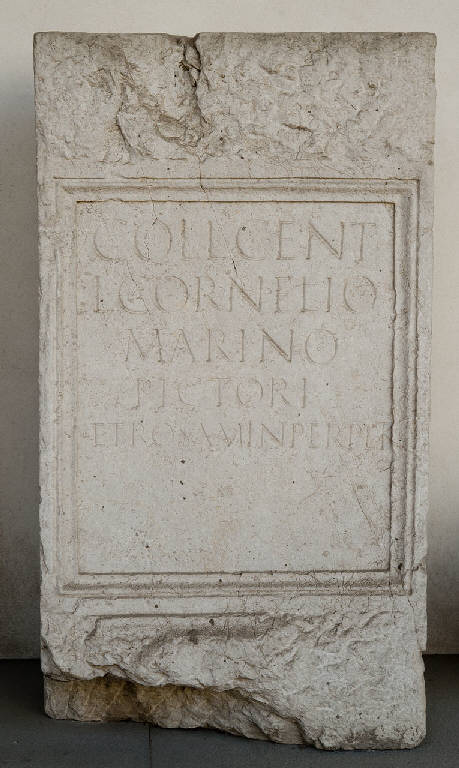 Ara funeraria di L. Cornelius Marinus Pictor. Lo specchio epigrafico presenta una cornice modanata, mentre la parte superiore e quella inferiore del blocco sono solo sbozzate