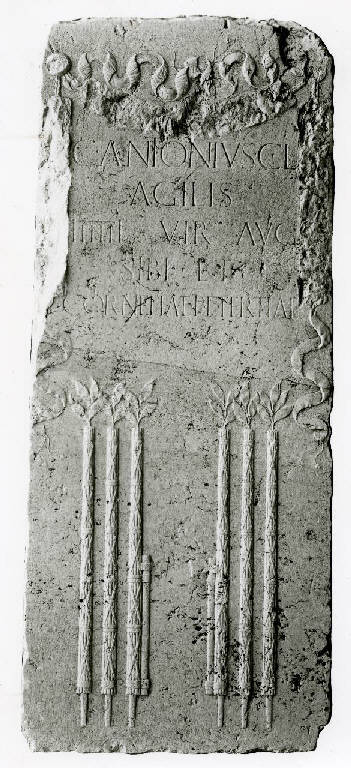 Il cippo presenta la consueta forma rettangolare, molto sviluppato in altezza e decorato solo sul lato principale. Il testo risulta inquadrato tra due festoni verticali ai lati e uno in alto, affissi a due placchette laterali da cui una benda con andamento sinuoso sopra in festone superiore, mentre altre due scendono da quelli laterali. La metà inferiore è invece occupata da due gruppi di sei fasces terminanti in alto con foglie. Il defunto fu dunque un liberto che rivestì la carica di seviro augustale, come riportato sia nell¿iscrizione sia nella decorazione, in quanto l¿utilizzo dei fasci era previsto anche per questo tipo di sacerdozio.