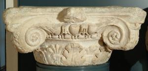 Capitello composito di colonna con una sola fila di foglie poste su due livelli sfalsati. Ciascuna foglia presenta sei ampi lobi arrotondati, cima leggermente riversa e costolatura centrale triangolare che si allarga alla base. Il bordo del kalathos è decorato da un astragalo a perline e fusarole. La parte di capitello ionico presenta volute a canale concavo terminanti in una rosetta a quattro petali; esternamente sono rivestite da una foglia. L'echino è decorato da un kyma ionico con tre ovoli entro sgusci separati da freccette; inoltre palmette a tre lobi si fuoriescono dalle volute e vanno a ricoprire parte degli ovuli esterni. L'abaco è bipartito e si conserva il fiore al centro. Sul piano di attesa si osserva una zona quadrata centrale delimitata da una canalina e due coppie di fori rettangolari, su due lati paralleli; la superficie, inoltre, presenta tracce di lavorazione a subbia.