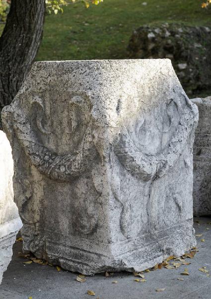 Ara votiva quadrangolare con base modanata, mentre i lati sono decorati da encarpi di fiori e frutta legati, mediante bende svolazzanti, a bucrani angolari.