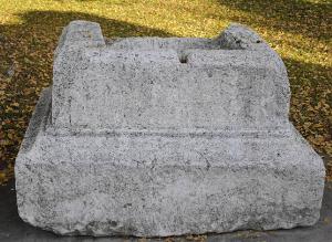 Blocco cavo a pianta rettangolare pertinente al basamento di un monumento funerario articolato in un alto zoccolo (38 cm) sormontato da una gola rovescia (9 cm) e un listello (alt. 2x3 cm). La parte superiore presenta quattro pareti lisce alte 31 cm e internamente un incavo con apertura circolare (Ø 60) ribassato di 10 cm rispetto al bordo superiore. Su questo si notano cinque fori per perni ¿ tre su un lato e due sull¿altro ¿ e uno per grappa ad elle sul bordo anteriore; altri due fori sono negli angoli della superficie ribassata. Il bordo, inoltre, è raccordato con le pareti lisce mediante una scotia di 5 cm. \nIl blocco era destinato ad un monumento funerario contenente l¿urna cineraria del defunto; sarebbe poi stato completato da un¿ara e da una qualche terminazione non precisabile.