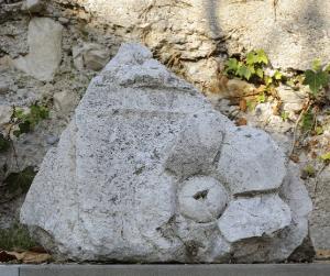 Frammento di cornice che conserva parte di una mensola e di un cassettone con un fiore centrale, profilati da gola rovescia a superficie liscia.