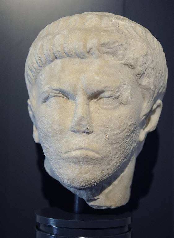 La testa presenta un ovale regolare, sfinato sul mento; lo sguardo rivolto verso destra, gli occhi piccoli e a mandorla, con la palpebra a cordoncino e le sclere prive dell'indicazione della pupillla. Nell'occhio sinistro un foro indica la sacca lacrimale. La fronte, bassa, è incorniciata da corpose ciocche di capelli, che si dispongono ordinatamente, su due file a formare una doppia frangia. L'espressione è leggermente crucciata, con una ruga centrale sulla fronte. La bocca è piccola e le labbra separate da un solco i cui estremi rivolti verso il basso contribuiscono a dare un'espressione non serena al ritratto. Una rilavorazione con bocciarda ha interessato le guance e il mento.