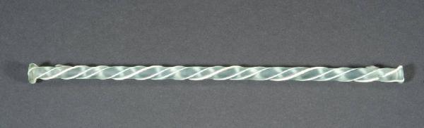 Bastoncino in vetro pieno, attorcigliato a spirale, con estremità appiattite a dischetto, decorato da filamenti applicati di colore bianco