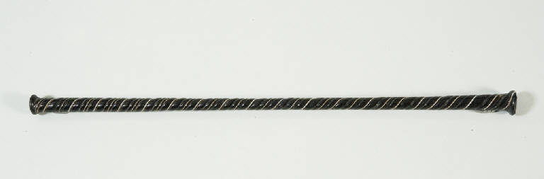 Bastoncino in vetro pieno, attorcigliato a spirale, con estremità appiattite a dischetto, decorato da filamenti applicati di colore bianco