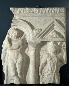 Fronte di sarcofago, di tipo architettonico, con erote e Vittoria
