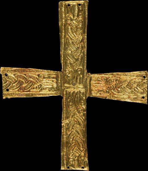 Croce a bracci lievemente svasati, con motivo ad intrecci zoomorfi e cornici perlinate. Alle estremità di ciascun braccio due fori per applicazione su tessuto.