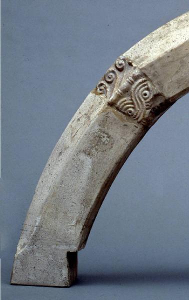 Arco per "pergula" lavorato sia sul recto che sul\nverso, indicando la collocazione a giorno del\nmanufatto, mentre il sottarco è liscio. Su una faccia la ghiera è costituita da fascia di larghe foglie grasse affiancate e con apice aderente al fondo; segue, fra due listelli tondeggianti, una seconda stretta fascia con treccia a due capi assai compatta, che all'esterno si conclude con un motivo di fusaiole a doppio anellino. Infine si ha la cimasa piuttosto affilata che si collega a quella del lato retrostante, decorata da una\nserie di volute.