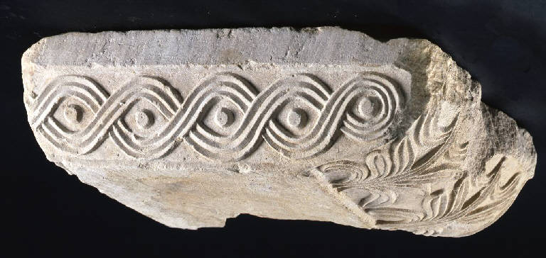 Frammento imposta, di cui rimangono due lati contigui in uno dei quali manca quasi totalmente il listello superiore e una parte dell'ornato, e di un piccolo frammento del lato lungo sufficiente tuttavia a confermare che doveva essere simile a quello del lato opposto. Su tre lati in alto è presente un listello aggettante. La decorazione è costituita da due alberelli stilizzati simmetrici e uno lungo con decoro a matassa triviminea; al centro degli avvolgimenti sono presenti piccoli elementi circolari a rilievo piatto.