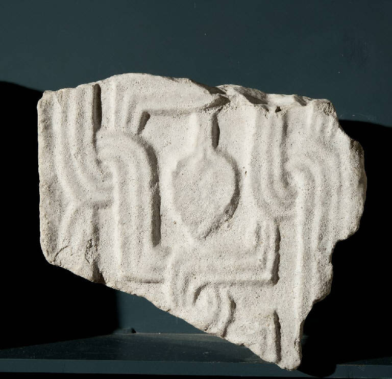 Frammento di pilastrino decorato su un lato con motivo a nastri a tre listelli che si annodano ai lati e costituiscono nel mezzo una serie di quadrati pure annodati fra di loro; ogni riquadro è occupato da un picciolo con foglia liscia. Sull'altro lato era un motivo simile salvo che nella parte centrale