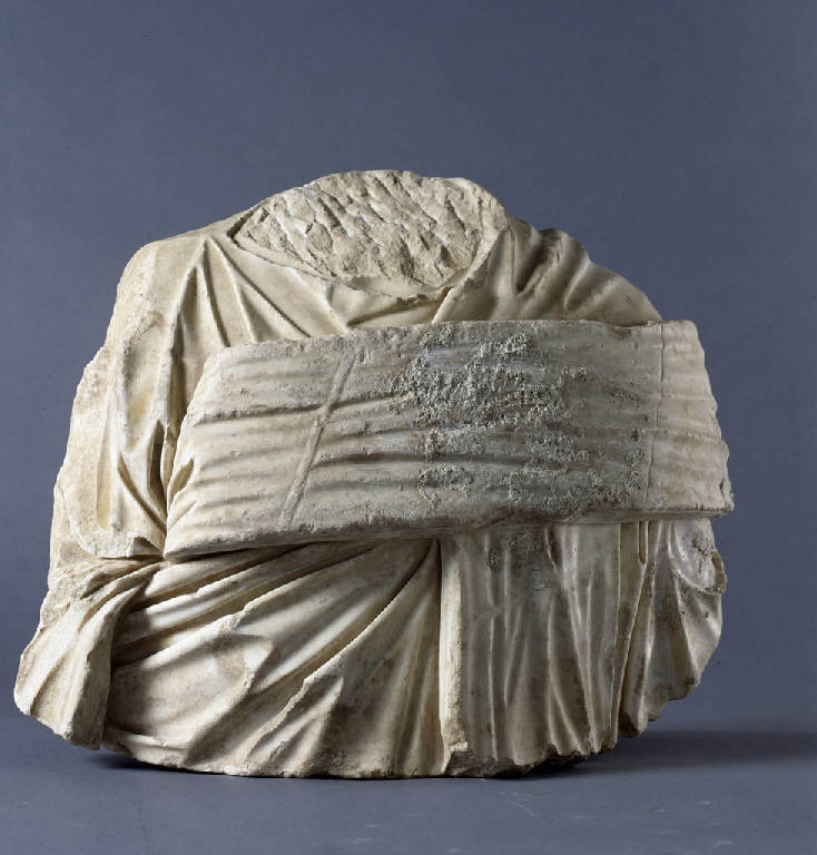 Busto virile acefalo con toga contabulata. Il pezzo presenta nella cavità interna un pilastrino d'appoggio a sezione quadrata