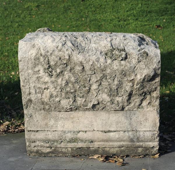 Blocco trabeazione con modananura liscia nella parte inferiore, mentre la parte superiore è stata scalpellata. Il lato destro è verticale, quello sinistro leggermente obliquo e potrebbe indiziare la messa in opera in un sistema a piattabanda.