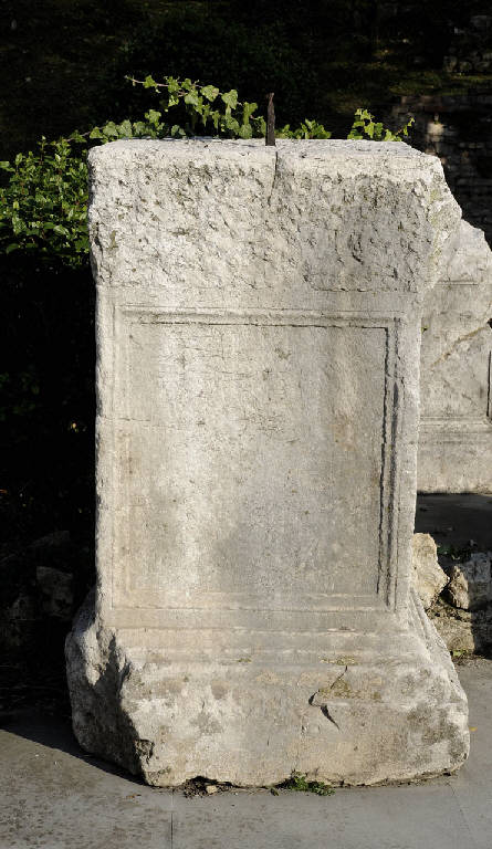 Ara con base modanata, lati incorniciati da cornici modanate ma privi di epigrafi. La parte alta è stata rilavorata. Sul piano d'attesa si osserva un foro per perno entro cui resta traccia di metallo.