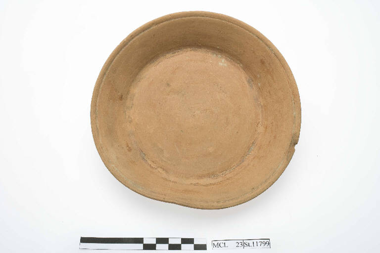 Patera con orlo liscio arrotondato sottolineato internamente da una solcatura, parete rettilinea obliqua che si innesta a spigolo vivo sul fondo piano, piede ad anello. Patera caratteristica del periodo di transizione tra la produzione a vernice nera e quella a vernice rossa; forma che si evolverà nel tipo Goudineau 1B della terra sigillata nord-italica.