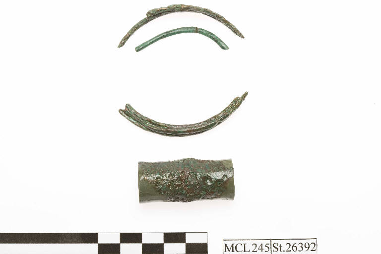 Frammenti di orecchino in bronzo con perla biconica tubolare.