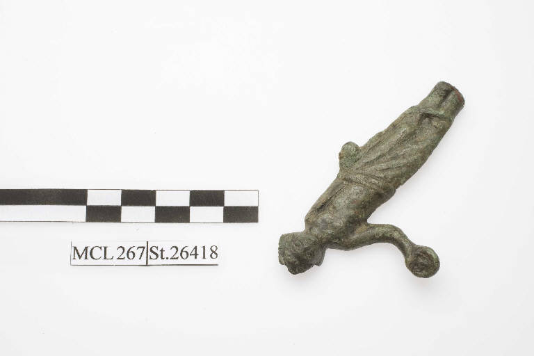 Manico di specchio in bronzo con figura di giovane offerente.
