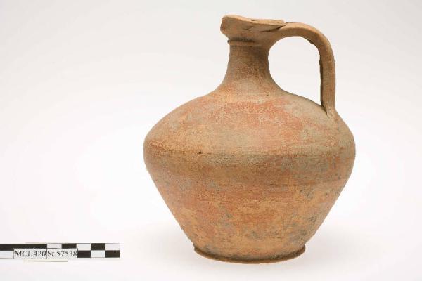 Olpe con orlo originariamente a becco sottolineato da una lieve costolatura, collo svasato, distinto con una lieve costolatura dall'ampia spalla, corpo a ventre rialzato, piede a disco concavo con due solcature presso il bordo. Ansa nastriforme a tre costolature.