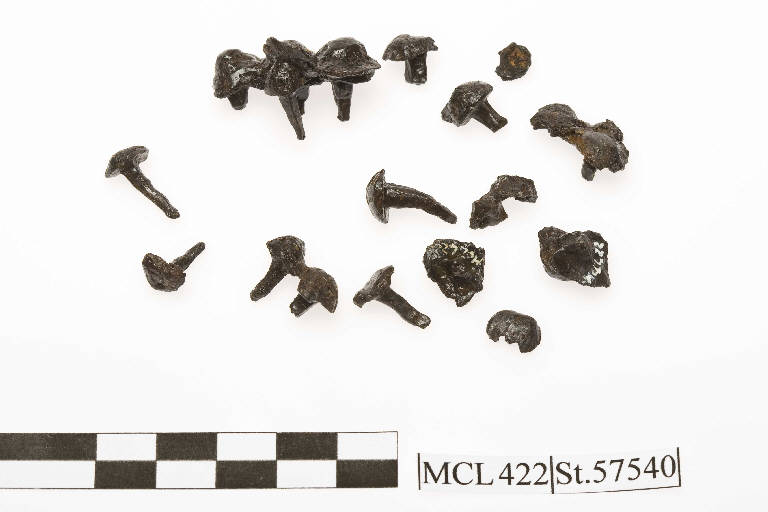 19 chiodini in ferro deformati e in alcuni casi fusi tra loro. Gambo a sezione quadrata, punta ricurva e capocchia emisferica.
