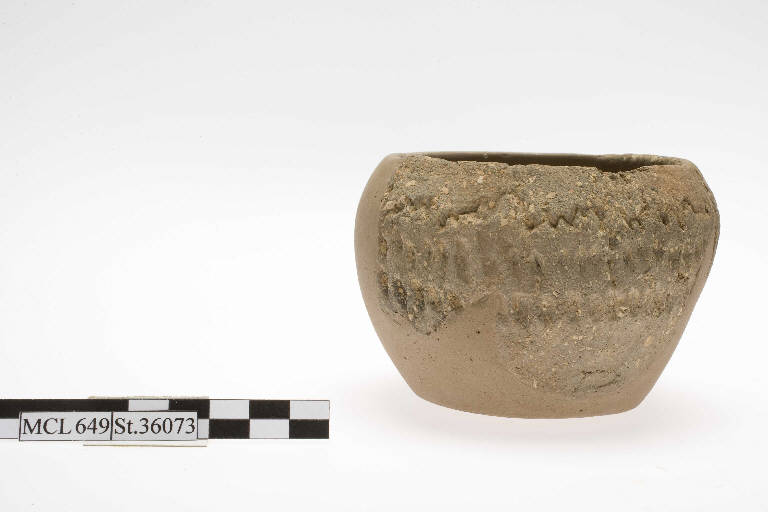 Olletta con decorazione incisa a trattini verticali/unghiate. Orlo arrotondato lievemente introflesso, corpo troncoconico. E' conservato solo un breve tratto di parete, mutila del fondo. Ricomposta e integrata.