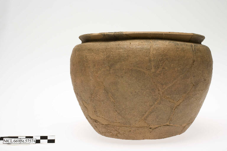 Olla con orlo estroflesso distinto mediante breve gola dal corpo troncoconico, fondo piano.