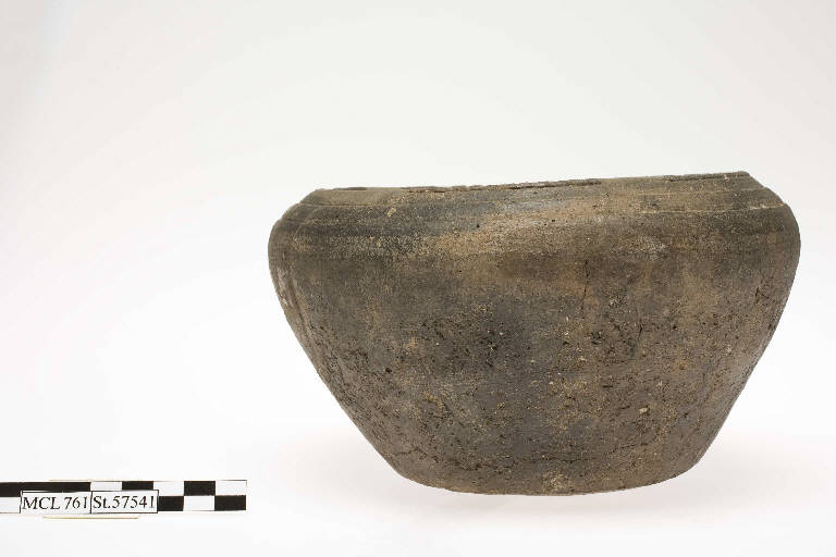 Olla con orlo arrotondato rientrante, decorazione costituita da tre linee incise sotto l'orlo e sulla spalla, corpo troncoconico, fondo convesso.