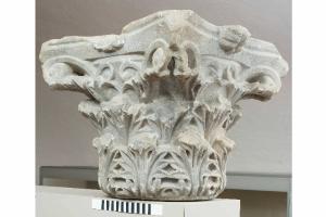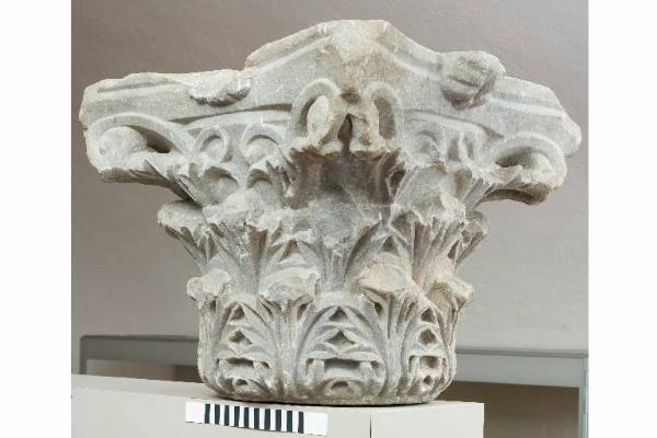 Capitello corinzio con kalathos rivestito da due giri di otto foglie di acanto spinoso di tipo asiatico, con i lobi per lo più congiunti e nervature molto marcate. Nella parte superiore caule appena aggettante, volute che invadono l'orlo inferiore dell'abaco terminando con una piccola spirale ed elici molto sottili con accenno di spirale. Abaco con fiore senza stelo a foglia carnosa, che sporge al centro dei lati sopra l'orlo del kalathos.