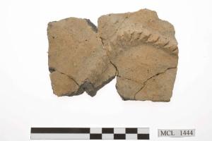 Frammento di parete di forma chiusa in impasto grossolano. Decorato con un motivo a cordone con unghiate.