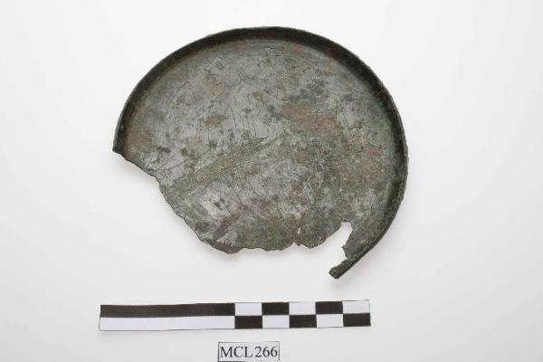 Specchio in bronzo con raffigurazione incisa di Lasa alata con aryballon nella mano destra