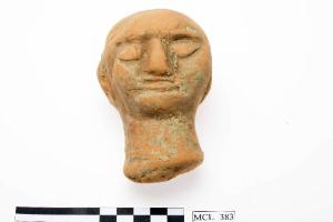 Testina fittile maschile in argilla depurata. Presenta una lieve depressione alla sommità del capo e l'orecchio sinistro schiacciato; internamente cava è rifinita a stecca. Lineamenti molto schematizzati.