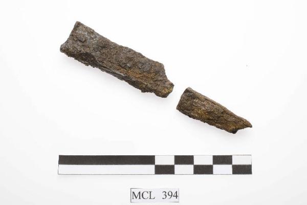 Due frammenti di codolo di coltello in ferro a sezione ovale.