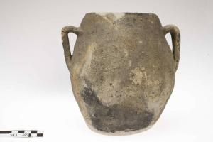 Vaso biconico ovoide biansato, mutilo del fondo in origine piatto, orlo arrotondato lievemente introflesso. Anse a orecchio a sezione ovale.