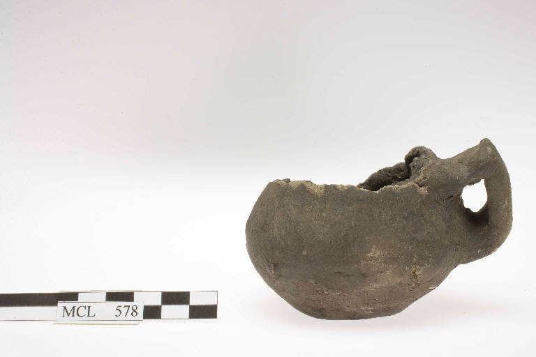 Boccale globoso monoansato, con ansa a gomito e fondo piatto.