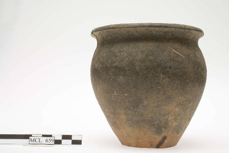 Olletta ovoidale, orlo estroflesso a sezione triangolare, brevissimo collo, fondo piatto.