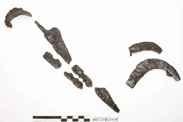 Frammento di falcetto in ferro, lama a profilo rettilineo verso l'immanicatura e ricurvo verso la punta. Nei pressi dell'immanicatura si conserva un chiodino in bronzo.