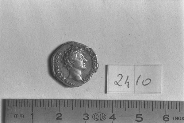 Recto: Testa nuda di M. Aurelio, a destra . Contorno di perline.\nVerso: Honos, togato, stante, rivolto a sinistra, con ramo nella destra levata e cornucopia nella sinistra. Contorno di perline.