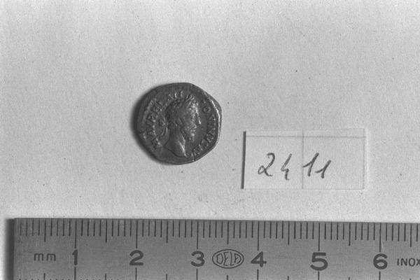 Recto: Testa laureata di M.Aurelio, a destra . Contorno di perline.\nVerso: Marte, con elmo e mantello svolazzante dietro il corpo nudo, gradiente a destra con lancia di traverso nella destra e trofeo sulla spalla sinistra. Contorno di perline.