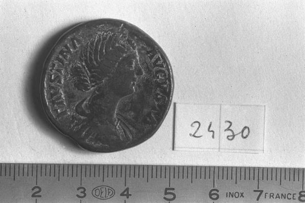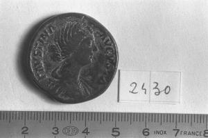 Recto: Busto drappeggiato di Faustina II, a destra , con capelli ondulati raccolti a chignon sulla nuca. Contorno di perline.\nVerso: Cybele, turrita, drappeggiata, seduta, a destra , in trono, con tamburo nella sinistra posato sul ginocchio sinistro e mano destra al fianco; a sinistra e a destra del trono, un leone. Contorno di perline.
