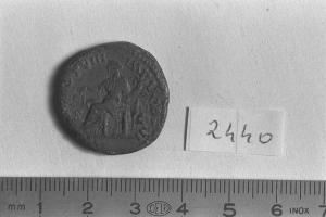 Recto: Testa radiata di L. Vero, a destra . Contorno di perline.\nVerso: Aequitas, drappeggiata, seduta, a sinistra, su seggio, con bilancia nella destra protesa e cornucopia nella sinistra. Contorno di perline.