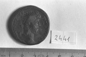 Recto: Testa laureata di L. Vero, a destra . Contorno di perline.\nVerso: Marte, con elmo e mantello fluttuante dietro il corpo nudo, gradiente, a destra , con lancia trasversale puntata davanti in alto nella destra e trofeo nella sinistra posato sulla spalla. Contorno di perline.