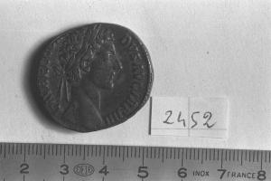 Recto: Testa laureata di Commodo, a destra . Contorno di perline.\nVerso: Minerva, con elmo, drappeggiata, stante, di fronte, rivolta a sinistra, lascia cadere dalla destra un grano di incenso sull'altare acceso (candelabrum ?), a sinistra, e posa la sinistra allo scudo ovale posato a terra, tenendo la lancia contro il braccio sinistro. Contorno di perline.