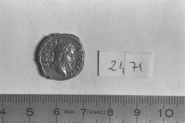 Recto: Testa laureata di Settimio Severo, a destra . Contorno di perline.\nVerso: Felicitas, drappeggiata, stante, di fronte, rivolta a sinistra, con caduceo nella destra e cornucopia nella sinistra. Contorno di perline.